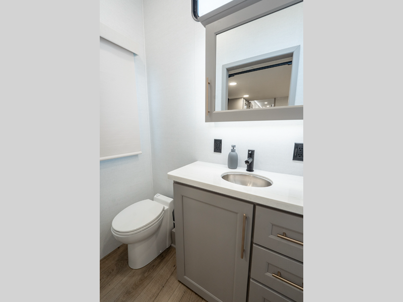 The Benchmark 8' 5" wide-body chassis, Mylar reinforced exterior seals, and insulated laminated rear wall will provide a durable fifth wheel made to last. There is a TSC - Touring Coil Suspension and Curt 8,000 lb. axles for the ultimate towing experience, and the 6-point hydraulic leveling will make set-up easier than ever. Head inside to find bronze hardware, atrium windows, a large residential shower, and roller shades throughout to provide privacy when you want it.